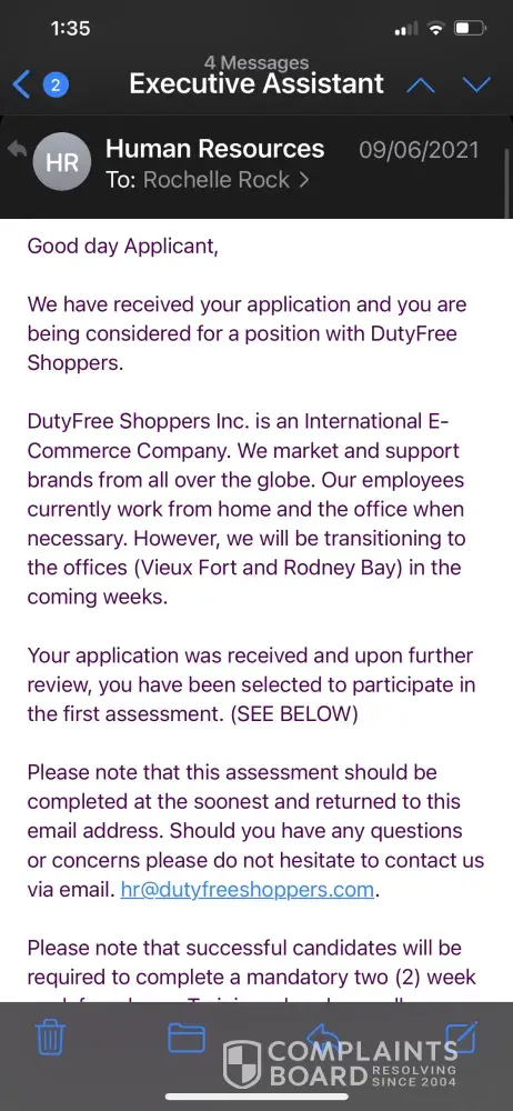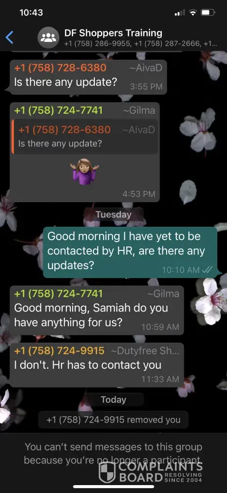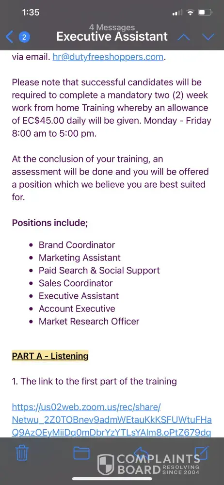 In May 2021 the company adversities vacancies in which I applied for the position of executive assistant. I'm June 2021 I received an email from HR which invited me to complete an assessment exercise in which if I am selected I would immediately start training and be place into 1 of 7 positions. It also mentioned that we could be paid $45 per day for this 2 weeks training. A copy of this email will be attached. A few days after completing this assessment I was called by the company to start training. I was told that I would be placed in a WhatsApp group in which further details would be given. This group was formed and no information was given however the training did start the very next day. During this training we were given many different types of work to do an was submitted at the end of the day. However no training was conducted for the positions applied for. After questioning Samiah Paul who identifies herself as the head of the branch in Saint Lucia told us that this training was necessary for evaluation purposes. This statement began the problems.