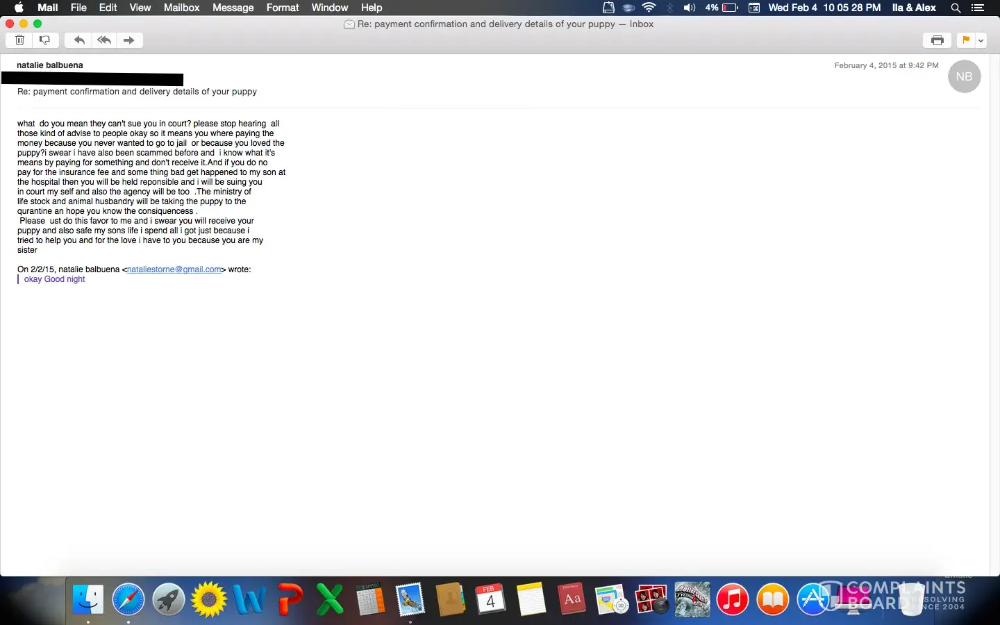 ...Also, They are saying this insurance is $650. Then because the seller (who is now harassing me and sending me concerning messages about their wellbeing) paid $250, they want me to send $400. While all this is going they are refusing to send me any of the paperwork/documentation/flight information, that has been done for this puppy.