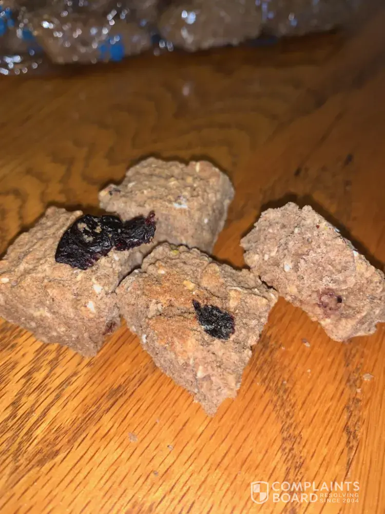 I picked up a 1 pound bag of granola treats for our golden retirever. When we got home and broke one open we realized these treats have raisins in them. I called the store and they insisted it was a blueberry. I tried one because I didn't believe this was the case, and it is a raisin. (the recipe is like a cinnamon raisin granola). I will not be giving...