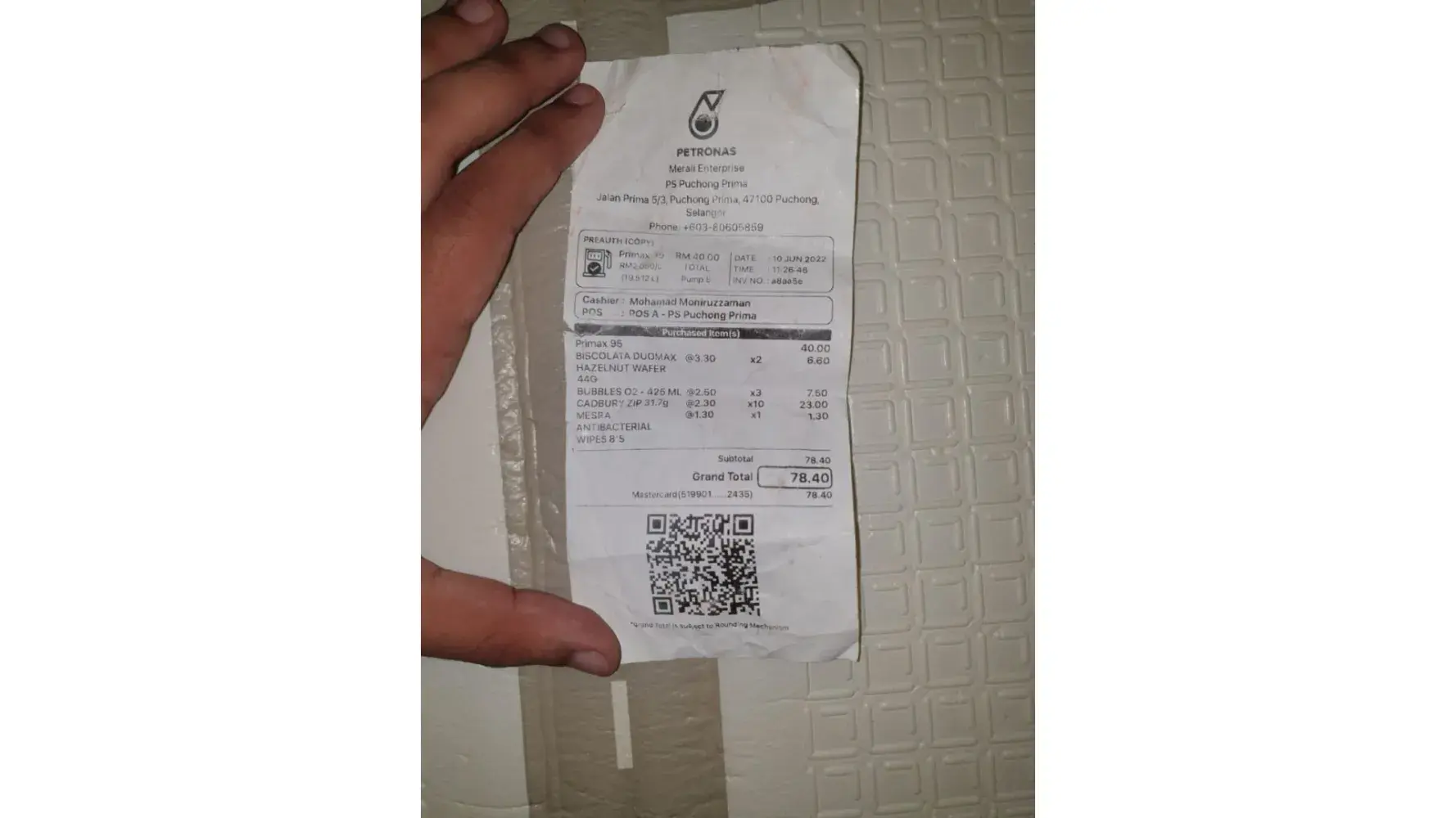 Pada 10 Jun 2022 pukul 11.26 pagi, saya telah ke stesen petronas tersebut dan telah berhenti kereta saya Perodua bezza bernombor pendaftaran PATRIOT 8735 di pam bernombor 5. Saya telah keluar dari kereta dan menunjuk ke kaunter pembayaran dan telah membayar RM40.00 untuk petrol primax 95 pada juruwang bernama WANI.