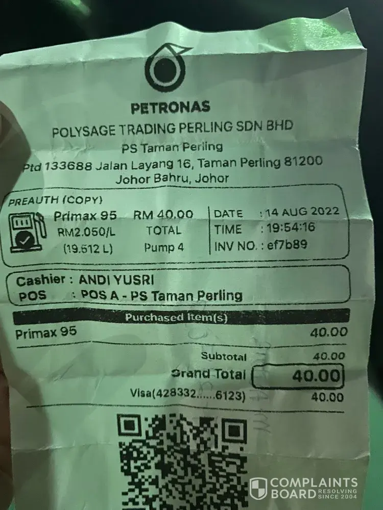 I am writing this complaint to highlight my grievances as well as to make sure such incidents did not happen again to anyone in the near future. This also reflects poor PETRONAS audit maintenance towards the station. By right PETRONAS such a reputable company should set a high standard towards their petrol station operators (dealers) at all times.