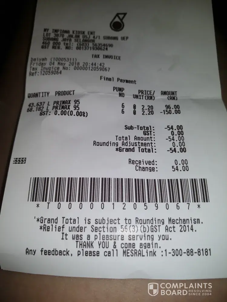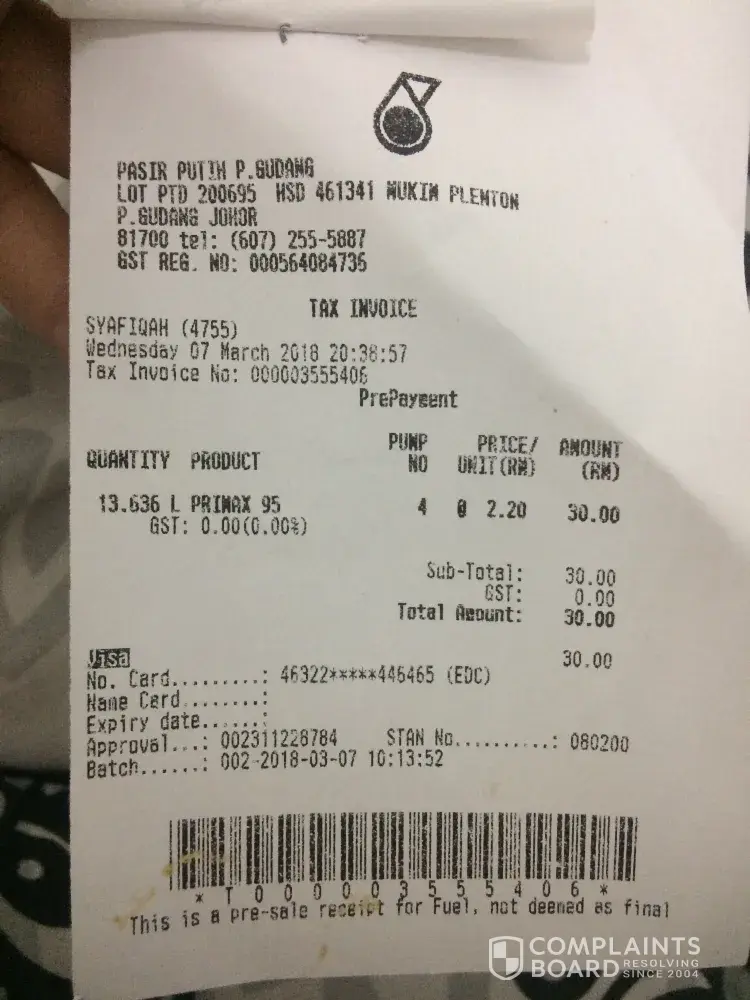 Petronas complaint for double charges to my credit card at jalan lobak petrol station