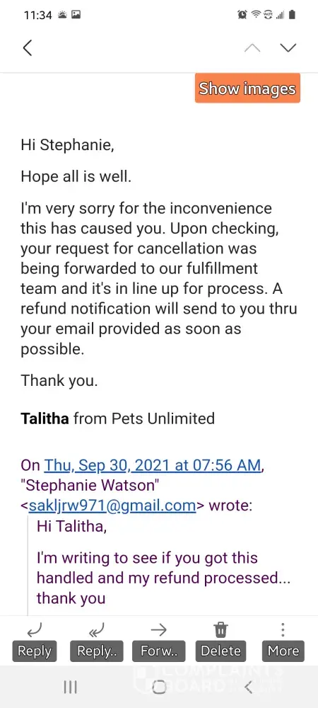 I ordered. They took my money. I never received an invoice or shipping information. I sent an email with no response. Sent another and was replied with my items out of stock but would be restocked the following week. The email was plan and had no pets unlimited info. Still another 3 weeks later and no invoice, shipping info or reply to 3 more emails. They stole my money.