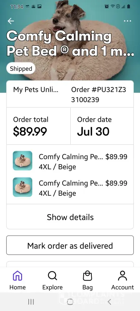 Ordered BOGO Dog Calming Beds on 8/25/2021.