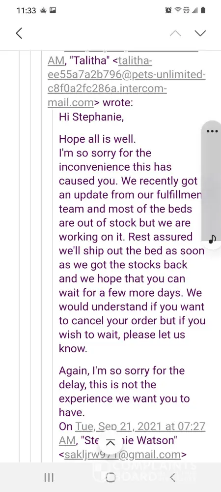 I ordered 2 beds from Pets Unlimited on September 13, 2021 and never received them. Tried contacting them and I get the same email over and over. I did some research today, October 20, 2021 and there is no longer an email or website contact. Just says does not exist. They are still advertising all over Facebook. I called my bank and put in a dispute so I can get my money back. This is a SCAM. Buyer beware!