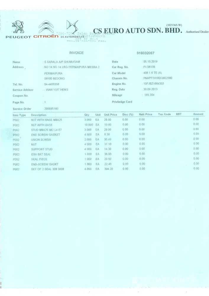 Thanks for your extended warranty for PLG6106 (Peugeot 408 - 1.6 Turbo) Malaysia registration number. After a lot of hassle for last few years (All the while the car being serviced at CS Euro Auto Sdn. Bhd. Taman Bayu, Butterworth, Malaysia.Tel 604- 3327001) the new engine and other parts being fixed and the car being hand over to me on 14 October 2019. After i just drive not even 10 kilometers (with the happiness of new engine and all problems being solved) the "engine faulty repair needed" error pop . The car is under power and the rpm is very high. (All the while same problem being incurred few times and got lodge a complain.) I drive back the car to the center again. As per service personnel the car not enough fuel after fill up should be "ok". After refill the petrol, the problem still there. Than the service personal try to do something and error being resolved. They said the problem solved. After i drive again about 30 kilometers on the way home, the same error pop up again and my car went under power again. Just imagine my trust again the car and the service personal. I call up again and they said i need to drive in again to recheck. I really do not understand what kind of services being provided by the above service center either its a car problem or the service personal is not trained enough. I told them to give me the permanent solution and until till to date i did not get any further feedback from them.