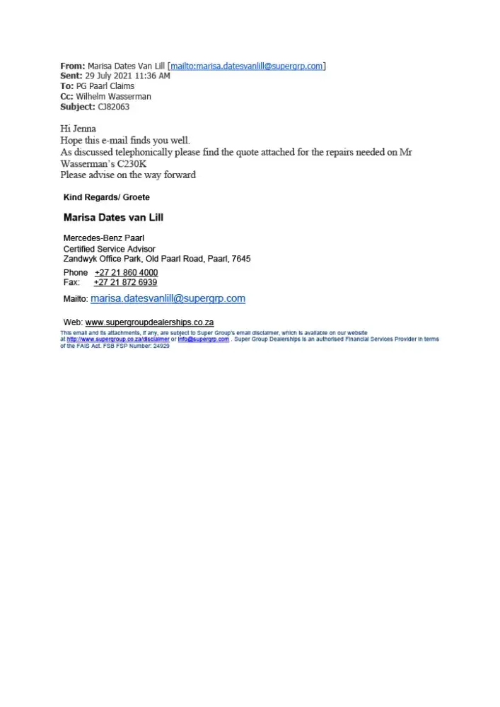 Mercedes reached out to PG PAARL, indicating the replacement cost.