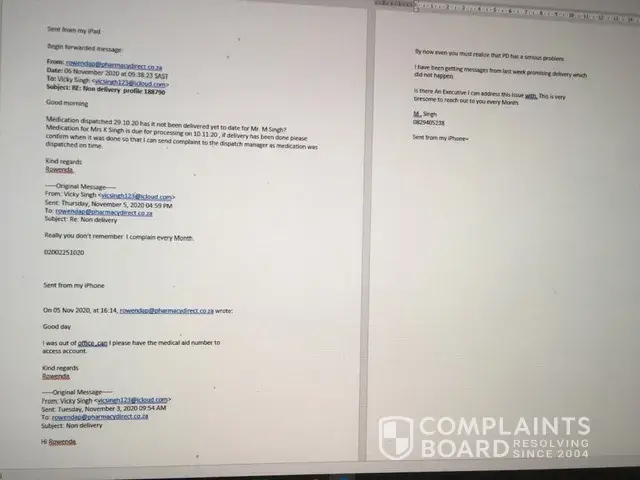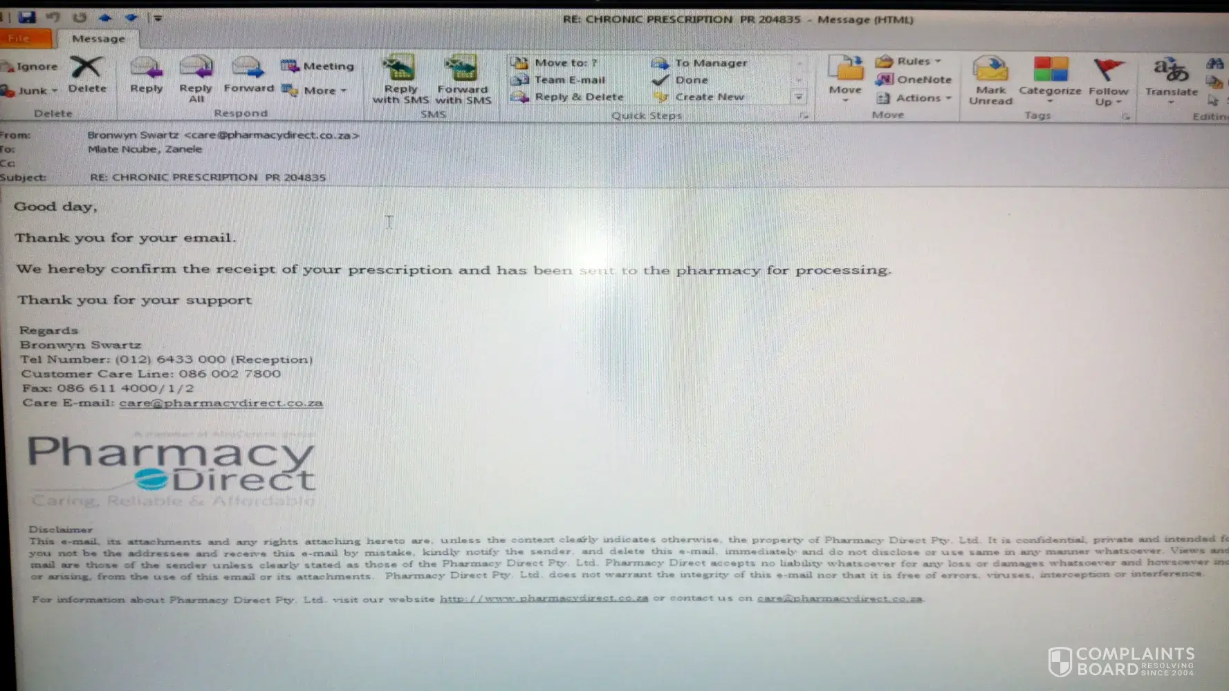 I complained to Rowenda ([protected]@pharamcydirect.co. za0 as I have done previously. Here is where the Clown show becomes farcical. She is supposed to be an Escalation Officer but is barely in her Office or looking at Mails. always get a response like I am not available or out of the office.