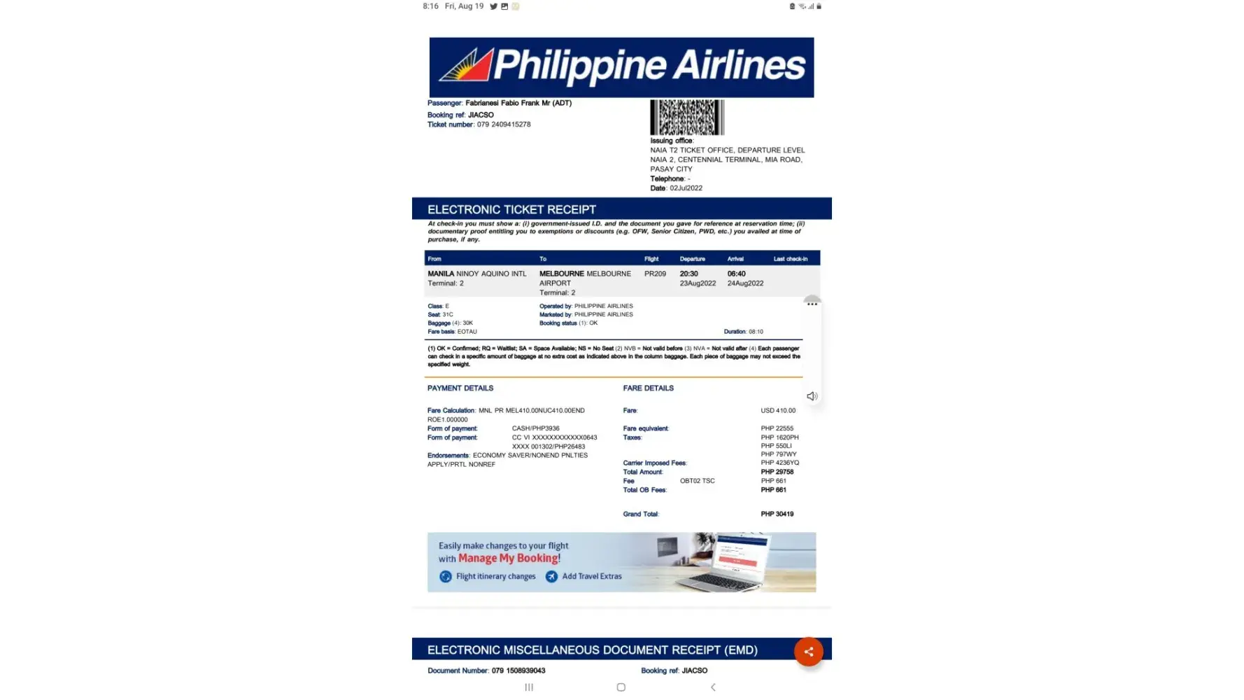 I recently purchased a flight ticket with PAL airlines one way flight to Melbourne Australia I paid $813 Aud plus cash money totaling P 3936 (101.75 aud) combine total of $914 aud if you convert that to peso its 35355.35peso but on my ticket they showed grand total of 30419 peso I have attached Pal ticket plus my bank statement showing these amount