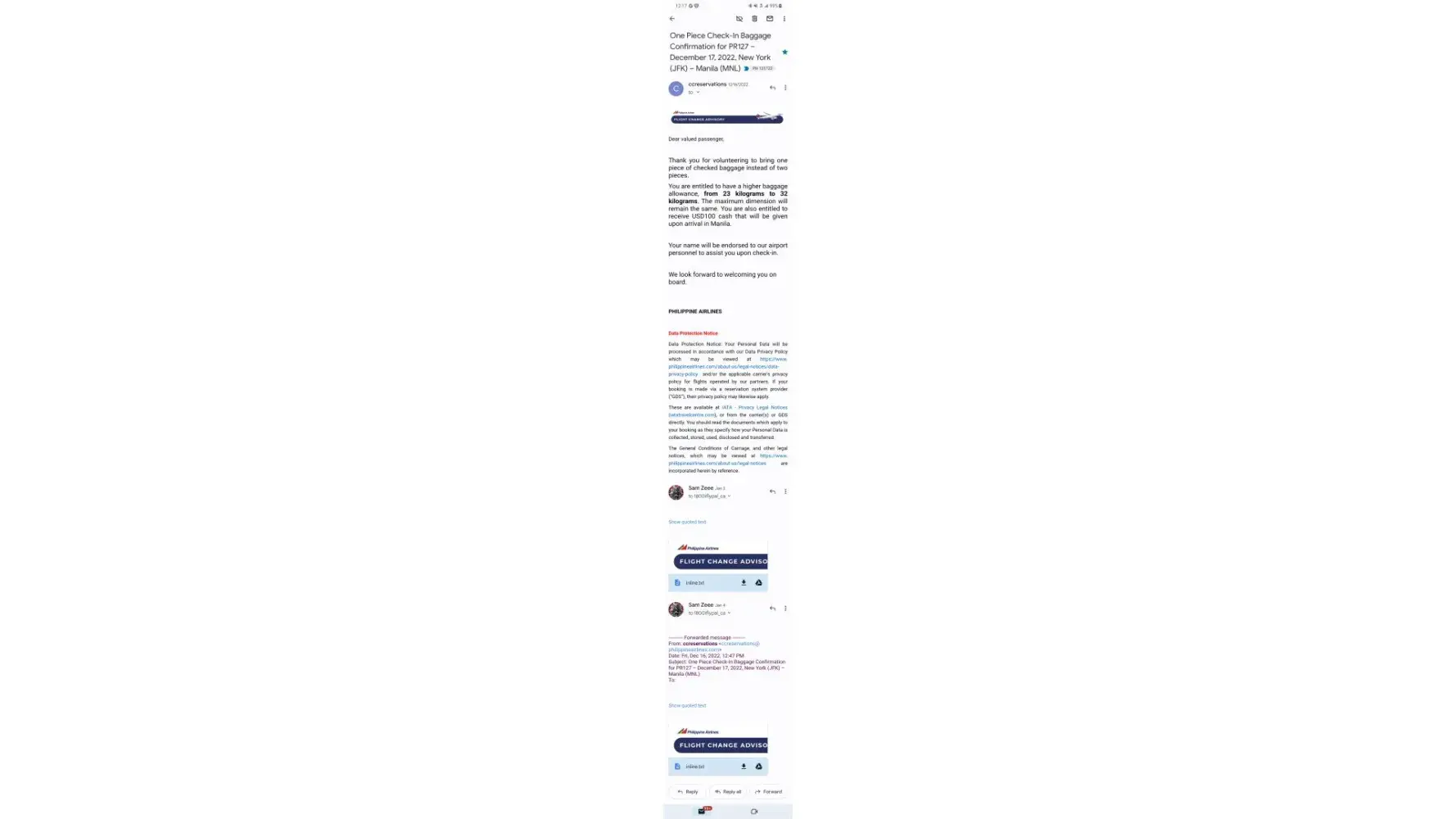 On December 16, 2022, I received an email from PAL asking if I can bring on board one check-in baggage instead of two, I would be issued $100USD upon arrival in Manila.
