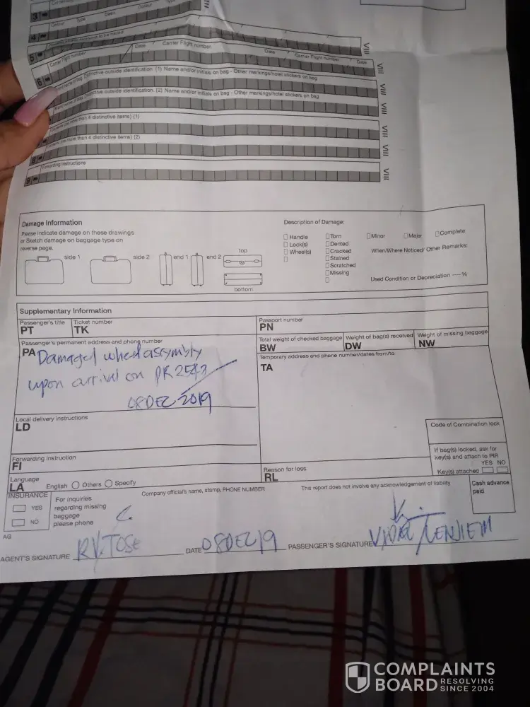My name is Lenjie Vidal. I'm filling a complaint because of my bag got damaged on arrival in Dumaguete with my flight from Manila. It's a Thule brand carry on size bag 10 kg that I've checked in in Manila airport . Ive asked the lady in the counter to put fragile sticker and she did. How come the wheel got broken !? It's obviously being thrown and not handled carefully the way it's forcly creased halatang nabagsak or binagsak ng malakas. FYI Thule bag is a really well made and really high quality Swedish brand. This bag cost 350 USD or more. My flight was with PR 2543 that was supposed to board 13:25 in Manila but it was delayed for almost 2 hours which I completely understand there might be some technical issue why it got delayed. And the guy at the gate let the non-senior citizen to let through first and we were just watching and asking why he did it. 😤 Not good service and there a lot of witness. This is unacceptable that my high quality bag got it's BIG wheel broken .😠 It's the most durable wheel you'll ever see in the airport . It's not a normal size wheels for a bag 😔and the bottom is so messy like it has been fallen into the ground and that really make sense because it was raining when we arrived. That's NOT good and I can't travel with it anymore. I would appreciate it if you take an action or replace my bag because I'm planning to travel again soon. It never happened to me taking flights with Cebu Pacific most of the time and now I took your airline flight & this happened😤