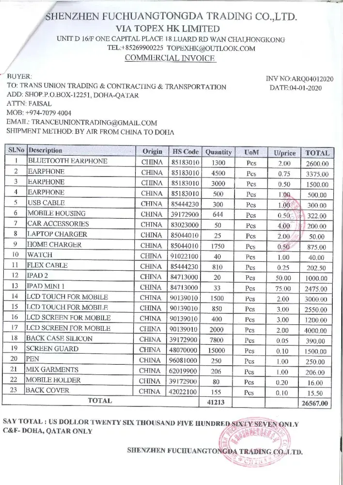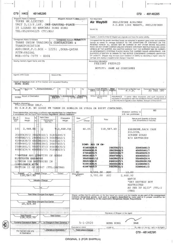 This mail is to bring to your notice that the Airway Baggage we received from Philippines Airlines in DOHA on 12.01.2020 was damaged / torn and the contents inside the cartons are missing. The Air Way Bill no is [protected]- Shipment from Philippines to DOHA - 05.01.2020 - TOTAL BOX - 161, TOTAL WT - 2468 Kg. Shipper Name : Topex HK LTD, Hong Kong . Consignee Name : Trans Union Trading & Contracting & Transportation, Doha, Qatar. Items missing are below :