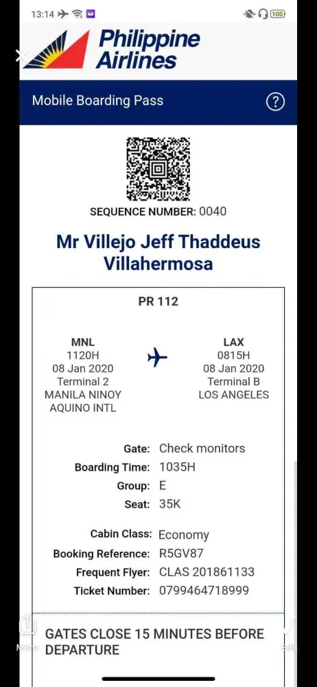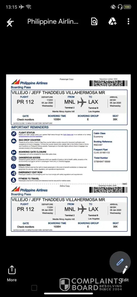 I am filing this Complaint against Pal for and on behalf of my nephew Jeff Thaddeus Villahermosa Villejo who took the Pal flight last Jan 8, 2020 Manila Phil's to LAX PR 112 left at 11:20h.