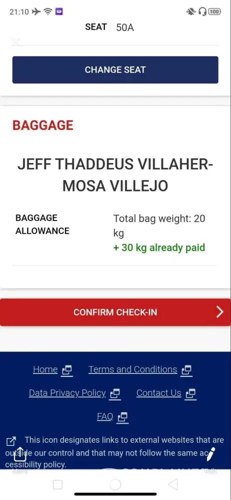 I used an ipad and a laptop to try again and it still didn't work. I eventually asked my partner in Ireland to do it for me, and he just about succeeded after the website crashed multiple times. I got an email confrimation right away to say I had added 20kg additional checked baggage, all good and I was happy but I still had to pay the outstanding balance. My partner could not get through the website to actually pay for the baggage. I tried again once it was confirmed and still no luck so I figured, now that its confirmed, I'll pay the 900pesos in the airport, because there was NO OTHER OPTION AVAILABLE ON THE WEBSITE.
