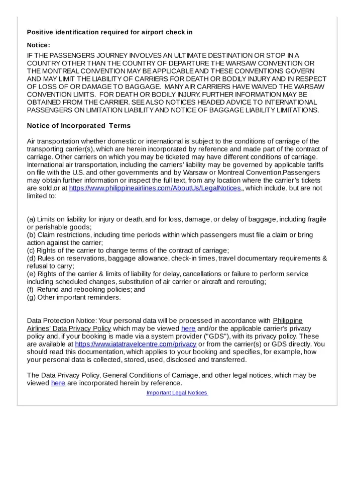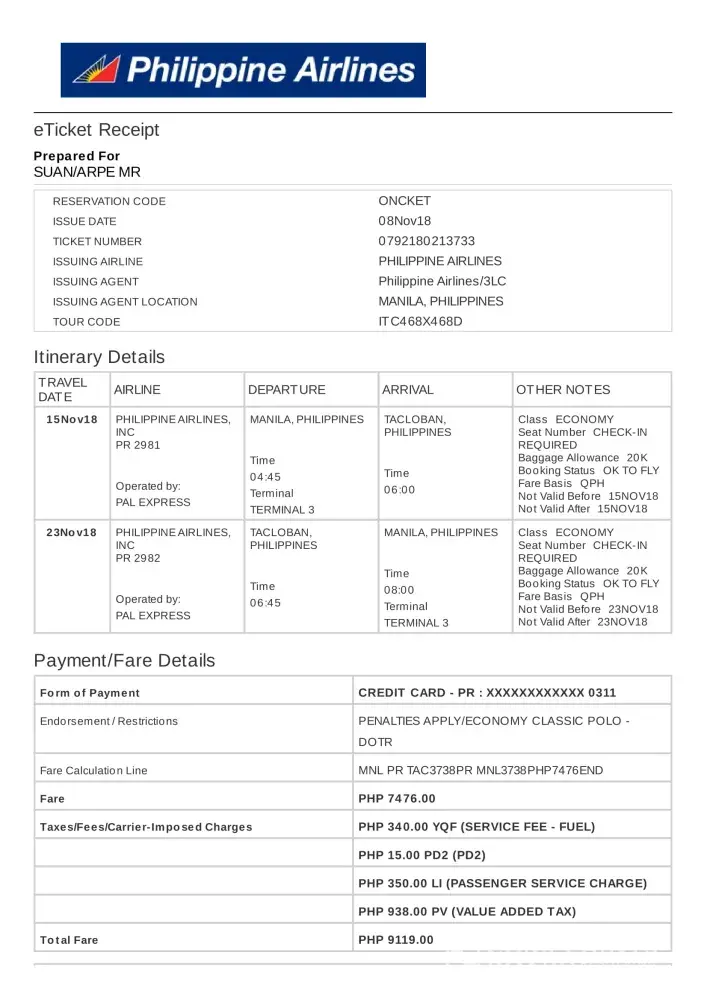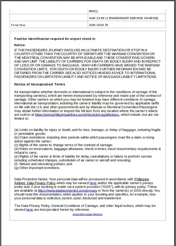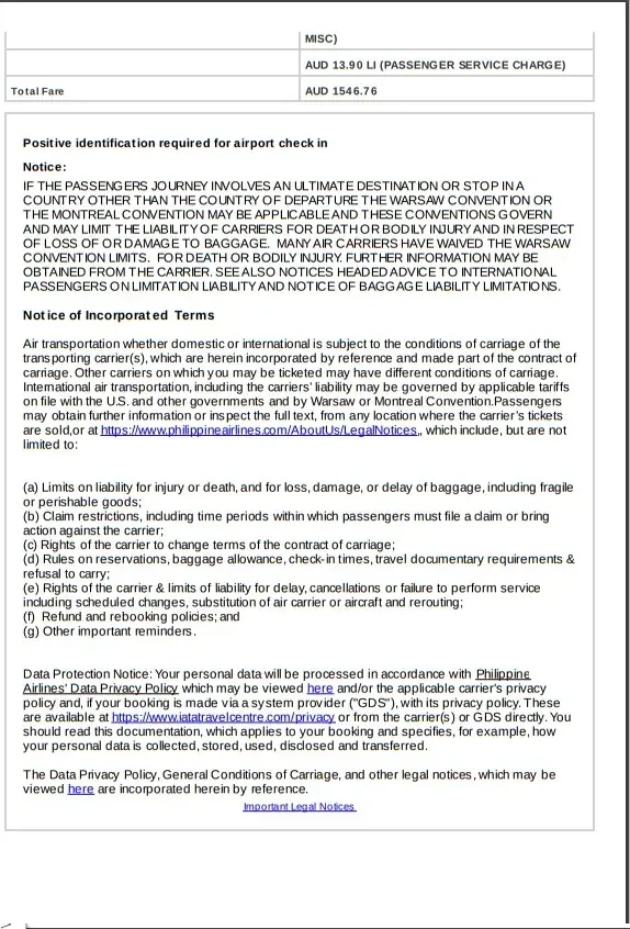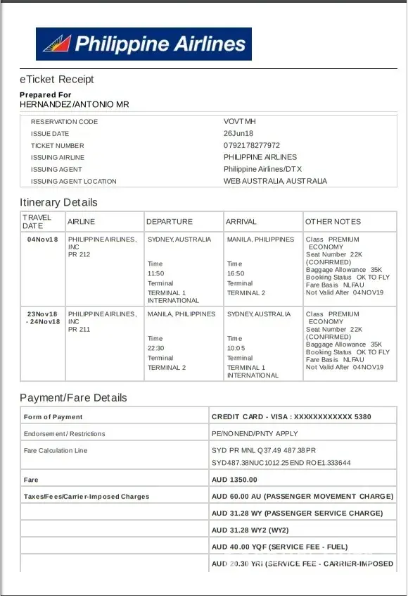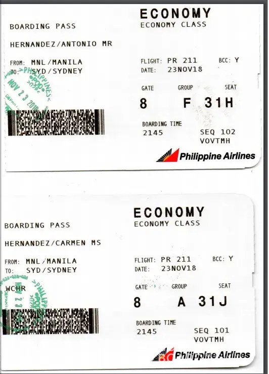 Sometime last June 2018, my wife and I booked two return flights from Sydney to Manila (Nov 4) and Manila to Sydney (Nov 23). Because my wife is diabetic and has difficulty travelling economy (we always request wheelchair assistance for her in airports), we booked premium economy as usual at a cost of $1546.76 per person. PAL sent us confirmation and receipt for the tickets. I attach here copies of the e-tickets stating the booking number, flight details and amount paid. I also attach our boarding passes on the return flight to Sydney.