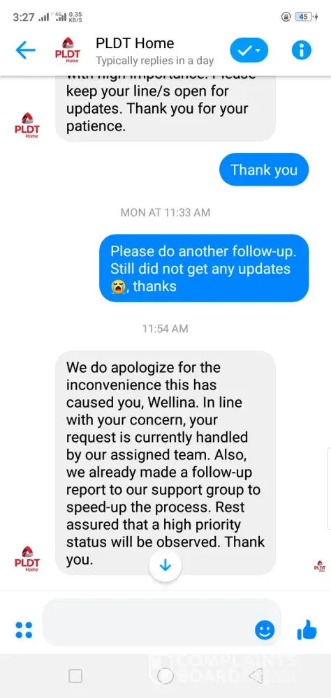 So I've waited and on the 20th July 2019 (Saturday), a line man by the name of Robert called me telling me when can he install the fiber migration, since it was sudden, I told the line man that he can come over the following day (Sunday, 21 July 2019) and the line man said yes. I have waited for him the whole day but he did not show up, but that is okay because that day is Pacquiao's fight, maybe he watched as the entire country did. SO the next morning (Monday), I also waited for the line man to show up, still a no show. So the following morning I started my follow up to 171 religiously every day; on the 24th July 2019 (Wednesday) the same line man (Robert) gave me call again saying that he will come again for the installation that Saturday (27 July 2019). Again, to my disappointment and dismay I waited for no one . . . . Since then I do my follow-up to 171 getting the same and answer and update.