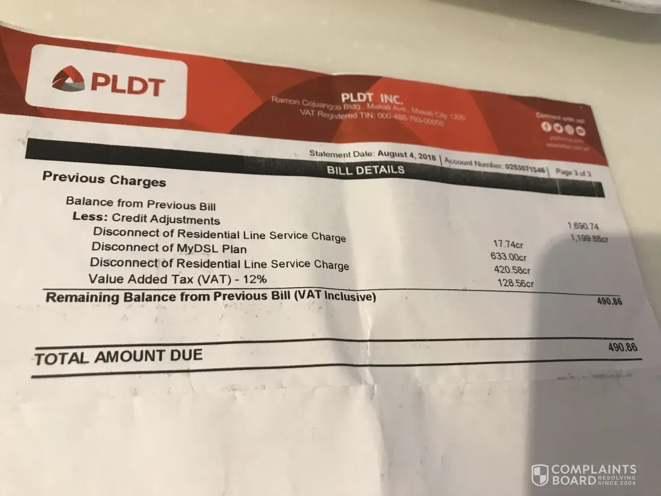 pldt landline and internet monthly bill amounting to php 490.86