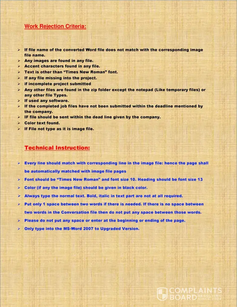 we Have a Genuine Work Report and you already match from your doc files which is not matched and you feel that i mistaken that error so that why you are doing some bad review. and you agreed with all term and conditions when your accuracy of your work goes below 70% you wont be refund and and wont be get your work payment we have a proof of Agreement between us and you signed that deal and agreed with that that all company T&C of Project. if you did and didn't mistake in those files our company will pay you 110% without any doubts but you not done good as per we discussed before starting work. so, all company pay to workers for their good work not for bad work no any company listed in google pay for their bad work if you are not satisfied of your work Report you can email us support@picasowebsolutions.com we will check more page cause as per team they checked that files and error's goes more than 100 in those files.
