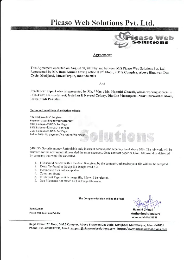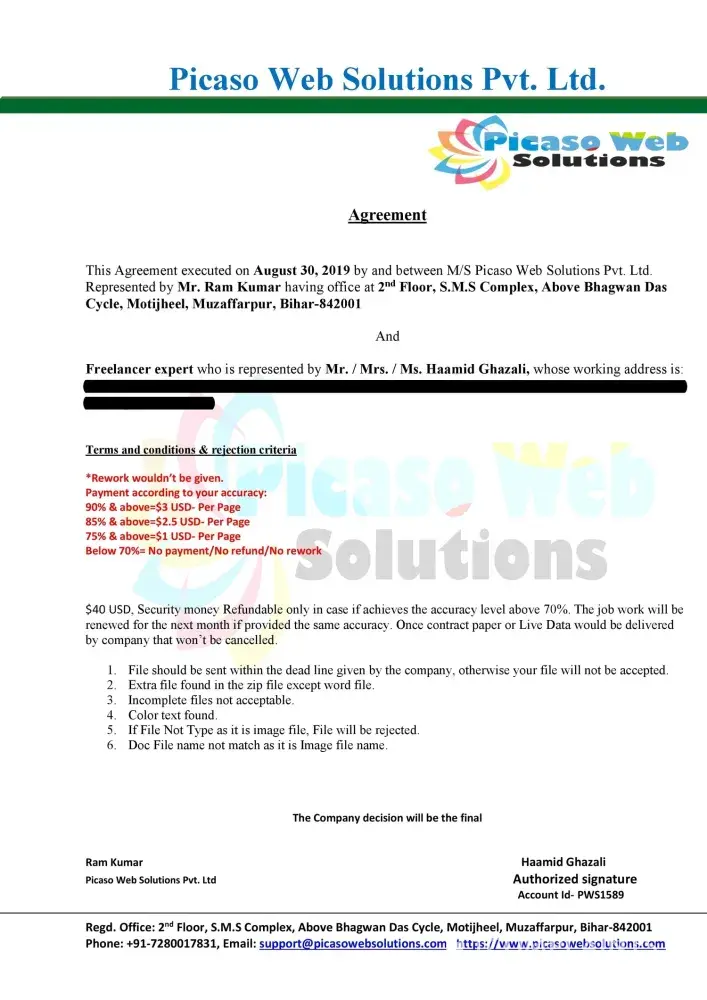 Initially, the Picaso Web Solution is very humble, polite to trap the people, they don't show their terms and conditions and once you pay the registration fee, they issue you a fake contract letter for satisfaction and let me tell you one imp thing, if you go through the contract letter, at the end of the 2nd page, they have written, a comment if a single file is rejected, whole project is spoiled, and that is below the individual signatures, which clearly depicts there fraudulent move and once you submit the project, they will come up with their malafide intentions and real colour.
