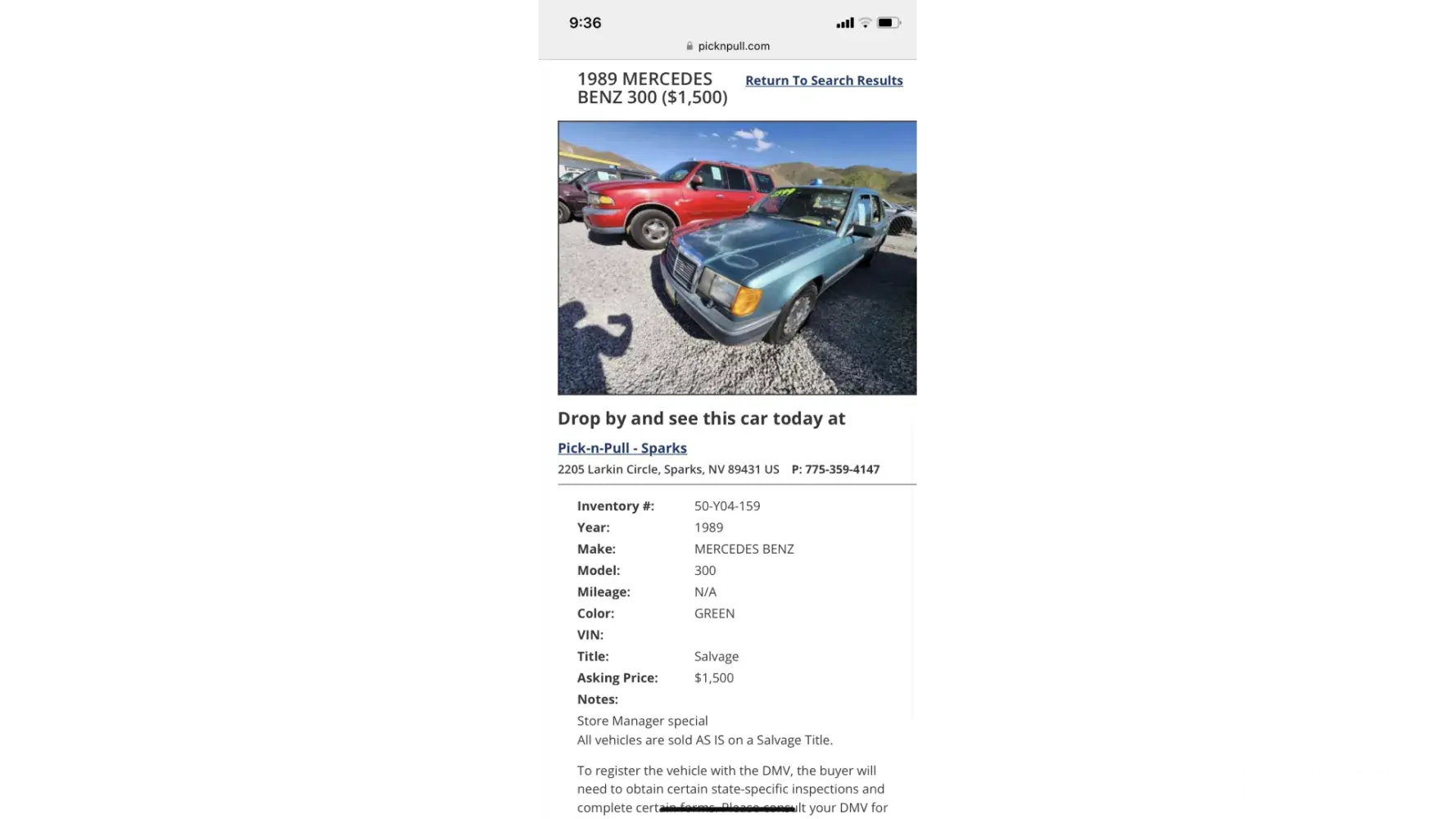 Hello. My name is Vitold Kapustin. I just bought a car (Green 1989 Mercedes 300E) from Pick and Pull in Sparks, NV location. I paid around $1700 for the car. I bought it yesterday on 09/28/2022. Here's how everything went: