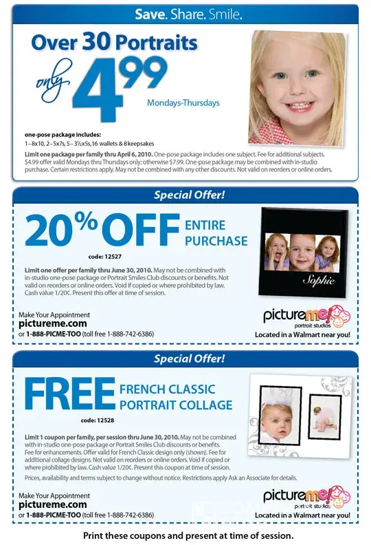 Picture Me Studio's in Walmarts are junk and a scam. There portrait packages are over priced and the make you buy there club everytime and the sad part it is good for one year. How many people have spent a extra ten dollars everytime they came in to get there photo taken? And the 4.99 deal doesn't say anything about a extra sitting fee, but they charge you five more bucks. Stay far from this company it's run just like walmarts. Buy a camera and put companies out of business like this. It sounds like. A great deal but in the long run it trash.