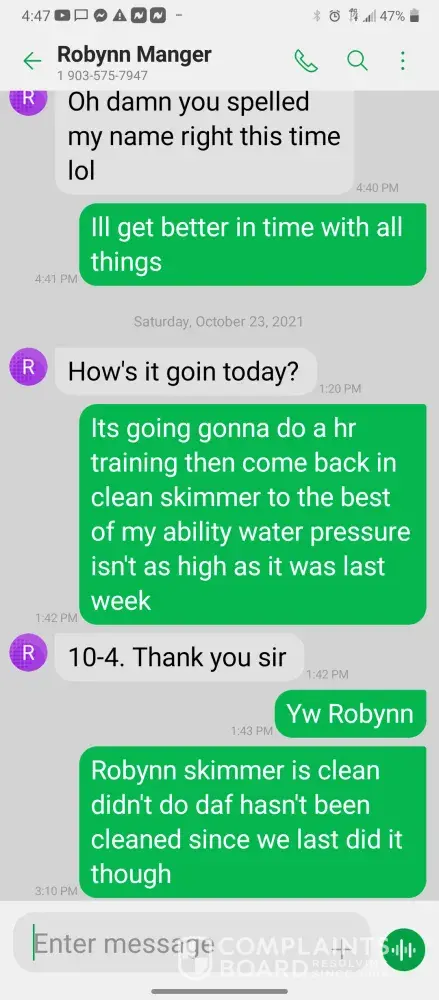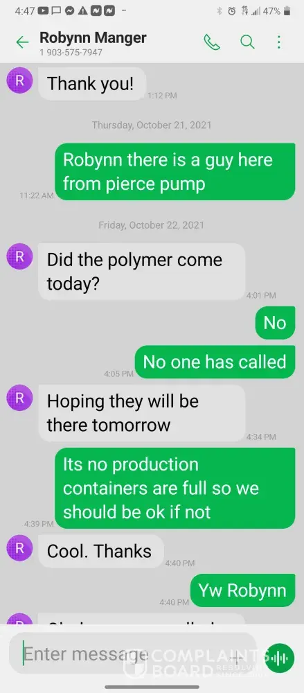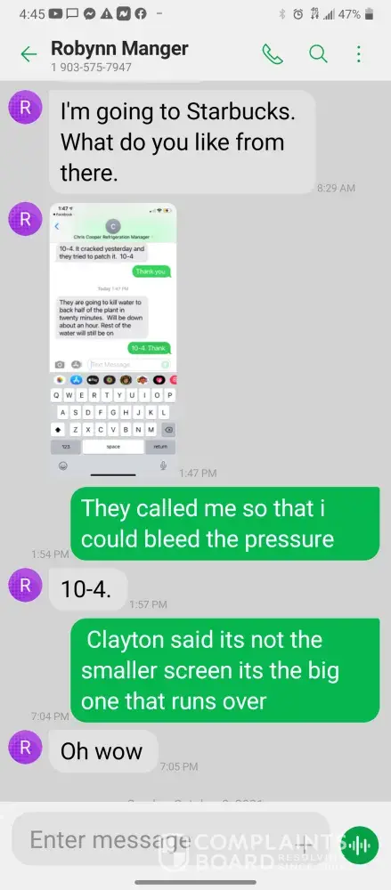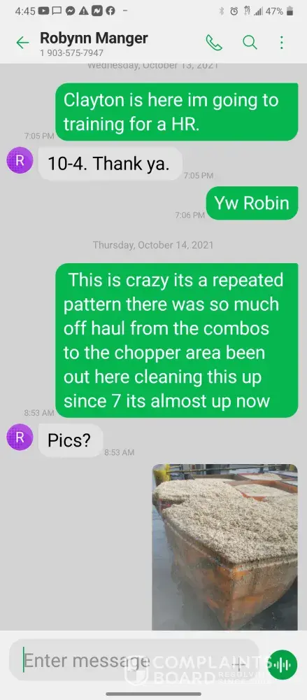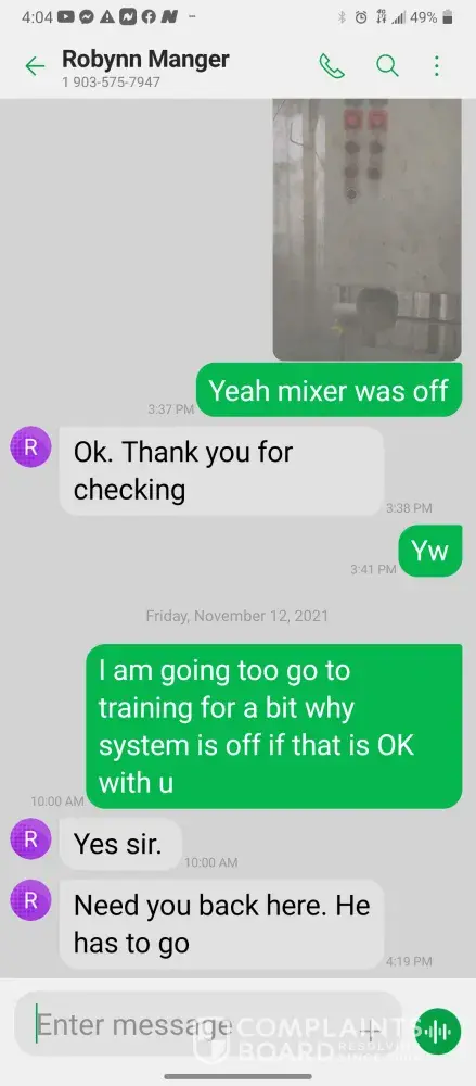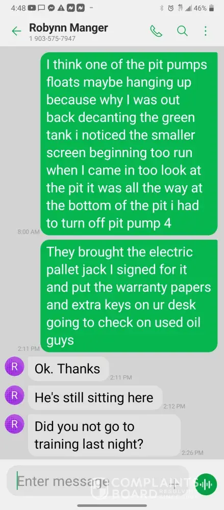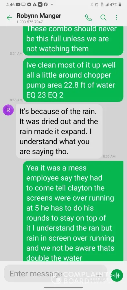 Hello so im james so every morning I get in there is something wrong with the system were im having too come in and fix the problem due too the operator not understanding the system so he just allows the system to run bad waiting for me too get in to fix it. So I did this yesterday as well as today yesterday it took a bit longer figuring trial and era but I finally got it comes in today same thing both ph are at a 10 daf and city so I ended up making a mess trying to get the water too not look like mud so after I got it back right I text Robynn and let her know it was fixed so after that I cleaned all floors while operating system. So remember I had to do trial and era so that means I had to check and clean all probes I also cleaned the turbidity lines and bucket checked all pumps to make sure that the daf was actually getting the chemicals that it should be getting so she comes in and ask me to clean all of those things again that I had ripped and ran cleaning to get water right for the shift before me but when she feel I dont clean she yells at me and right me up but if we read the books and view the camera im always the only one inside of waste water cleaning and operating and fixing things u will hardly see anyone else because they hide were the cameea cant see them are just sat out back pretending to be washing down patio and she is ok with that so today she comes in after ive cleaned the floors takes sludge out of the turbidity bucket and poor it on the floor and didnt even get it up who isn't a slave to clean up her intentionally mess up is ne so then I run system all day so had to go too hr at 3 I told the guy that works back there with me that I was leaving at this time system had 5.9 feet of water he ran it 20 minutes after I left she text me asking me why I wasnt back there when the system is off simply because she wants to find things for me to do but she didn't want to ask the other worker to do it this is pure harrasment and im sick of it i have recordings and ive been told she basically admitted to smoking and I know the camera shows her inside of waste water smoking and nothing has been done at all I proved my write up was bogus and still nothing happens and its foul play on everyones behalf because those careless mustake could have killed us all smoking around flammable chemicals and which she knows better but thinks and believes she can do whatever she pleases and you guys are riding with it until she makes the mustake of a lifetime ive proved she iss careless of others lives and a bullie of a manager and its all been ignored. She has broken all company regulation and committed major safety violation and its ok is what hr is saying basically.