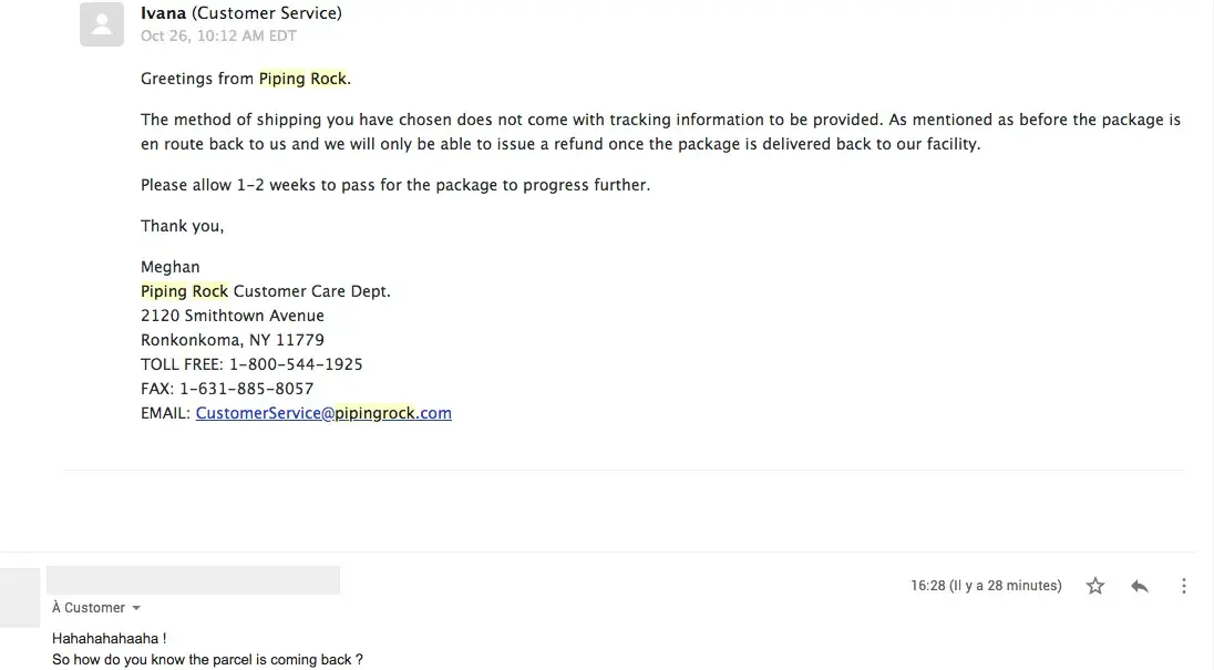 I’ve tried contacting Piping Rock via chat and I have no favourable response from them