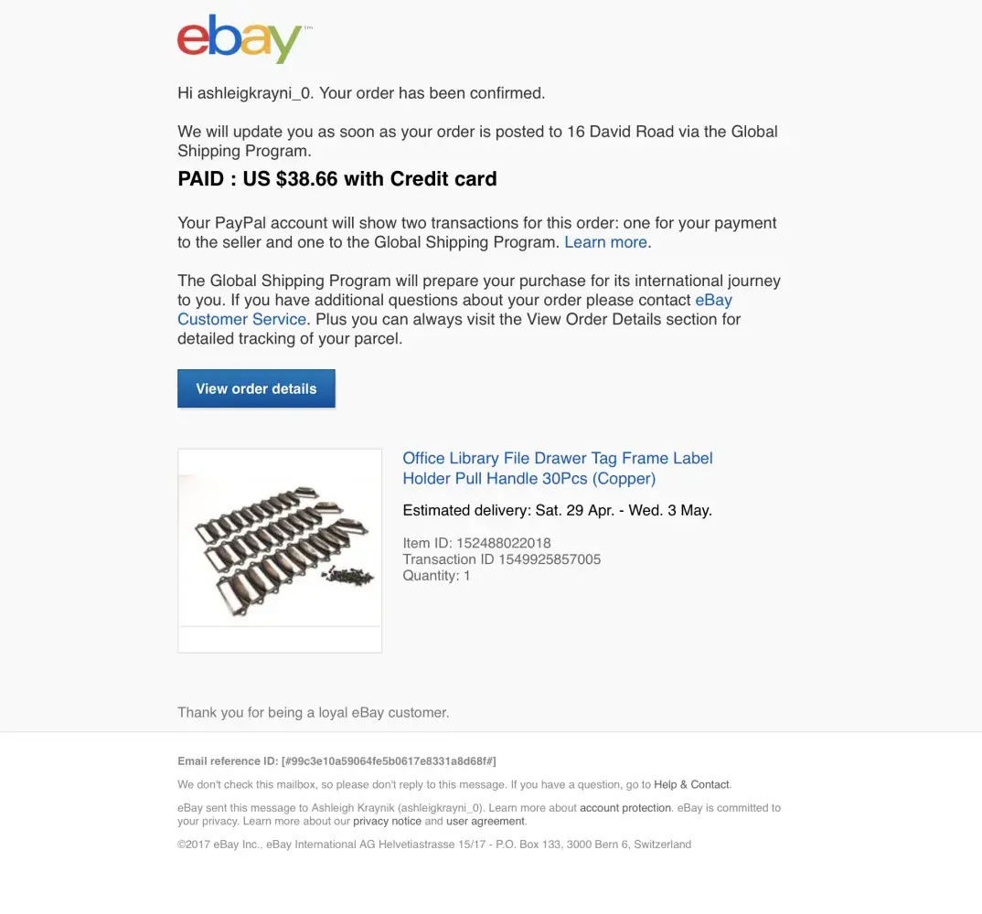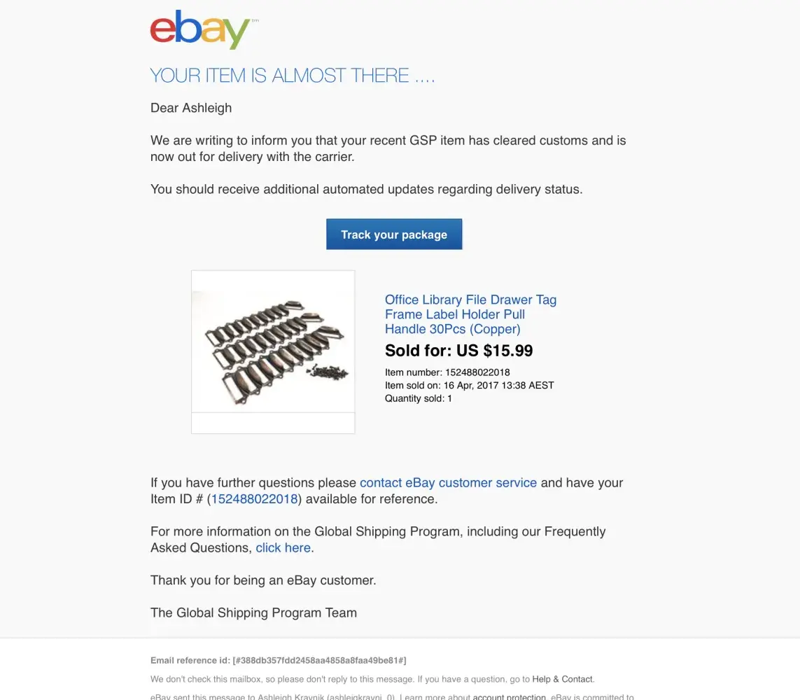 I received my package last week on 28th April at 12:01pm, cut open and with no product inside. The label on the package says "Resealed by the Global Shipping Program" however the package very clearly has not been resealed in any way. Basically, you have cut open a package, inspected it for customs reason (I imagine) and have failed to reseal the package and send to me. According to all the tracking information I have received my package, so there is nothing that the seller can do about this. And really, it isn't the seller's fault. This is a careless mistake on your company's behalf. The package contained 30 drawer handles which I have now had to source elsewhere. In the meantime, I would like a full refund for the purchase price. I have attached my purchase receipt as well as photos of the packaging.