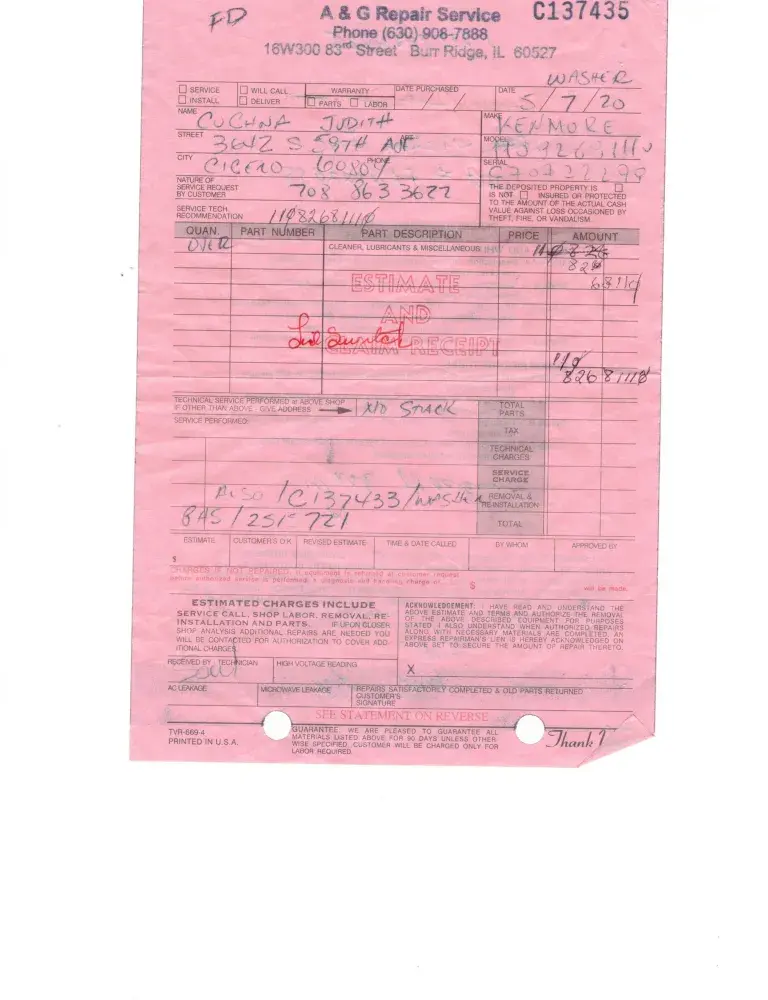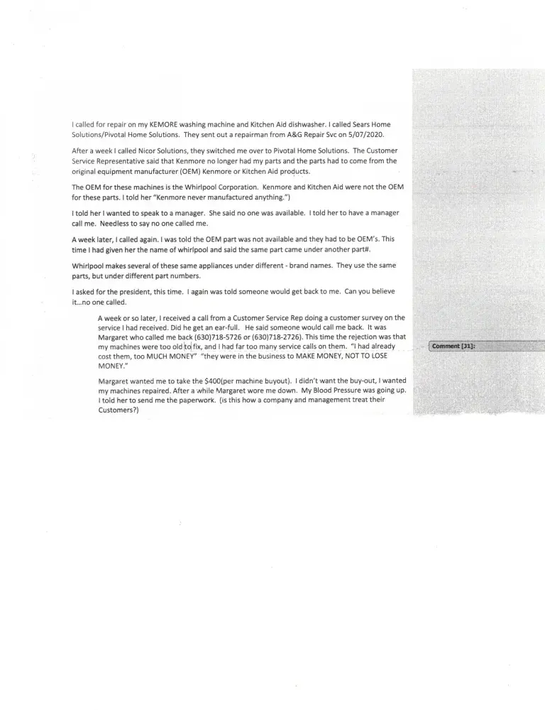 I called for repair on my KENMORE washing machine and Kitchen Aid dishwasher. I called Sears Home Solutions/Pivotal Home Solutions. They sent out a repairman from A&G Repair Svc on 5/07/2020.