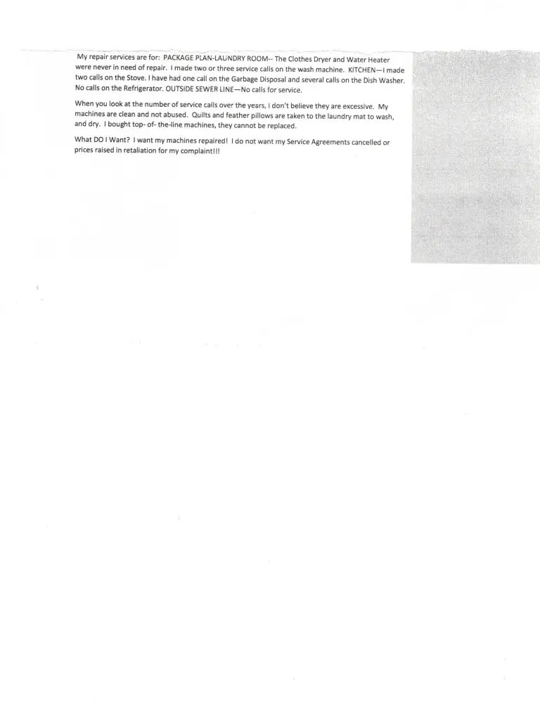 My repair services are for: PACKAGE PLAN-LAUNDRY ROOM — The Clothes Dryer and Water Heater were never in need of repair. I made two or three service calls on the wash machine. KITCHEN — I made two calls on the Stove. I have had one call on the Garbage Disposal and several calls on the Dish Washer. No calls on the Refrigerator. OUTSIDE SEWER LINE — No calls for service.