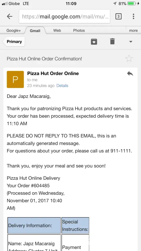 Now this doesn't often happen to me whenever I order food. But tonight I've decided to never order from Pizza Hut again until things have been fixed with their drivers. I have for several weeks now ordered from Pizza Hut's website whenever I have cravings for Pizza because I actually love their food.