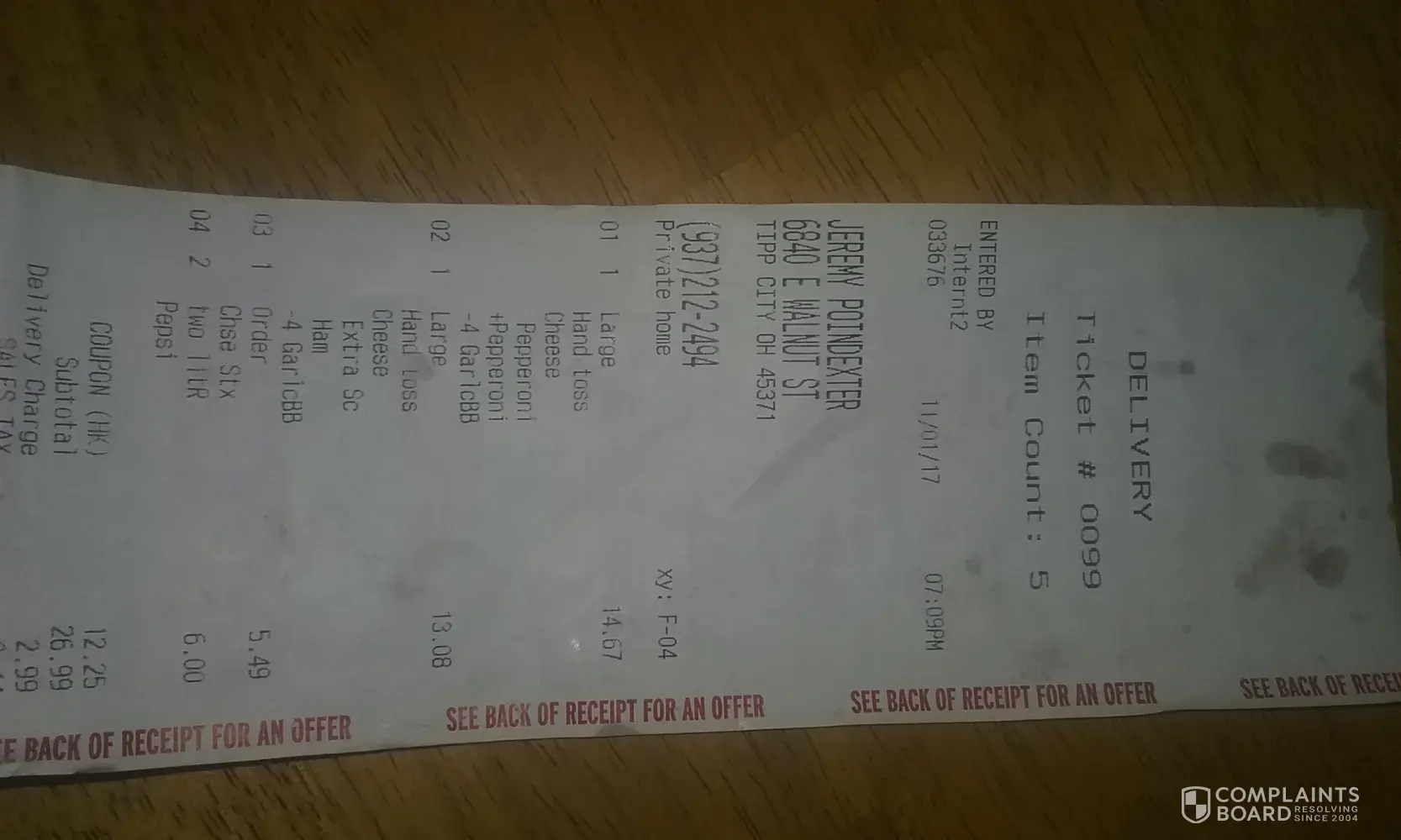 I'm complaining cause there service sucks my husband called 2 hours in advance for 3 dinner boxes with 2-2 liter sodas to be called to have someone take his card number and to give his order hang up and to be called back to be told they couldn't complete the order without the card and the ID of the person ordering the pizza, to be called back they didn't have enough dough for they order that they had, had a very busy weekend. I had to go pick up the pizzas and to complain to be told that he called the 800 number which i have the receipt which my husband didn't called the 800 number. I didn't receive my order correctly or my soda's or wings he was not polite he does not need to be a manager or any type of manager material . I think my husband should get a refund on his money soda's and wings.