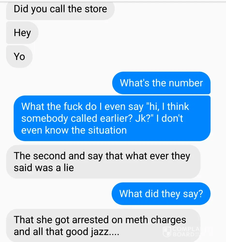 My daughter called to inform your company of an employee named Brianna Bye and her recent arrest for possession of methamphetamine, maintaining a common nuisance, possession of paraphanalia, and possession of marijuana. My daughter called the store but then the store called Brianna and gave her my daughters name and number so Brianna called and demanded that she re-call the store and say it was all a lie, so my daughter did because she was being yelled at. I do not feel comfortable with an establishment that has employees that do methamphetamines and then threaten my daughter for informing their place of work demanding she recant what she informed the manager. I am also upset that your store gave Brianna my daughters name and phone number, which is the only reason she knew who to call and threaten, which, again, was my 14 year old daughter. Do you not offer anonymous complaint lines that don't hand out the person's personal information so disgruntled employees can't seek revenge or demand the person, or in this case, child to recant?