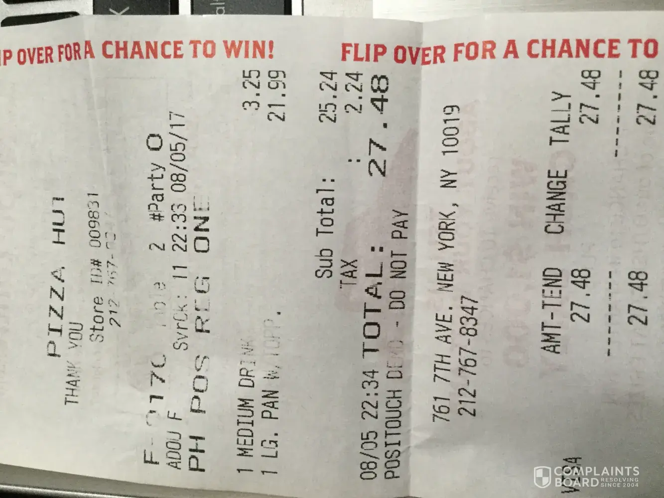 I am attaching the receipt of it and need some clarification from pizza hut that is it right or wrong.