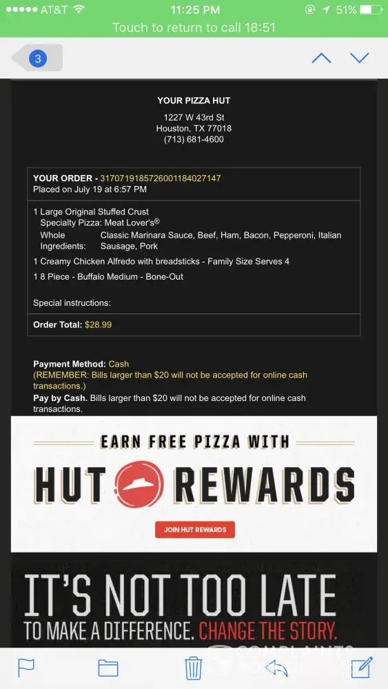 call pizza hut on my cellphone number [protected], (this Is what happened) I placed a call at the time shown, she answered the called, " hello this is