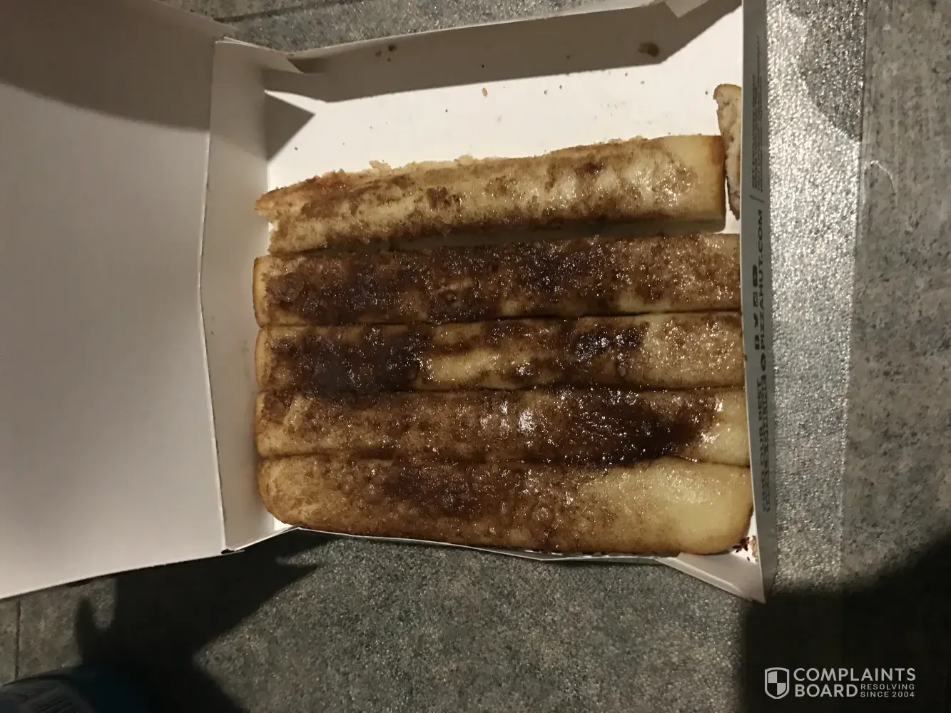 So the first issue which isn't that major is they had no large pizzas, we got 4 mediums instead but who doesnt have a large pizza? But my main issue was the cinnamon bread. (photo) they looked so messy and it looked like whoever made it had no care at all and just slopped on the cinnamon. Also they were so disgusting and did not look appetizing at all and I received no icing which I payed for.