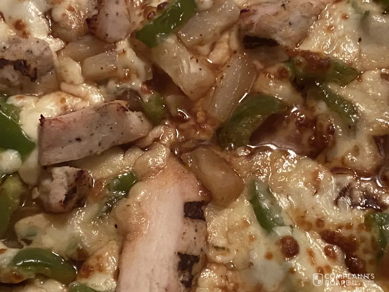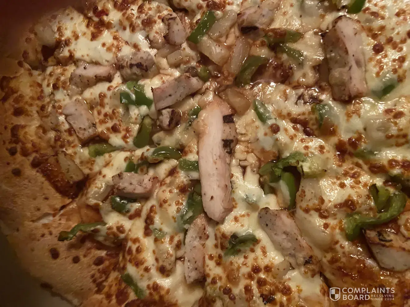 My pizza box seal was broken and there is a puddle of water on top of my pizza the water on top is not from condensation, the amount of water is just gross and when I tilt the box it moves and runs down the pizza its literally in the middle I took a screen shot of it if you need to see it the chicken is raw Pink the meat was not cooked the pizza was rushed out and not cooked thoroughly I ended up throwing away the pizza, we are in a pandemic and my box should not be tampered with .