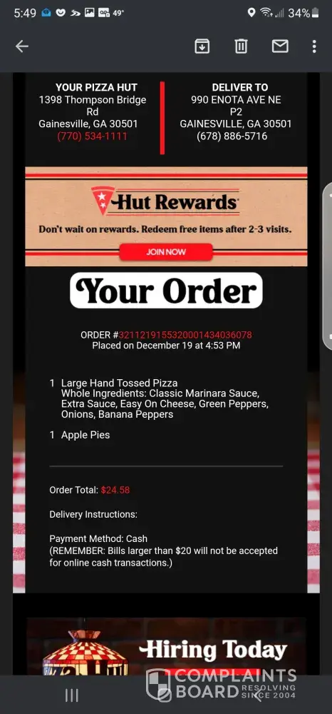 This is the third weekend in a roll that your pizza hut in Gainesville Georgia on Thompson bridge rd has not giving me my order. When I call to ask about it they say I never ordered. So I get in my car and drive there to show them my confirmation number and everything. Your manager there pretty much called me a liar and said I haven't ordered instead of...