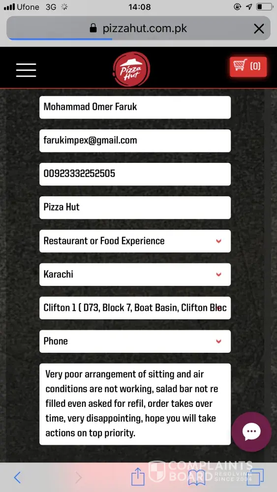 Very disappointed to visit pizza hut at boat basin where sitting arrangement and air conditions are in worst condition, mr. Sher hussain branch supervisor can't help us out.