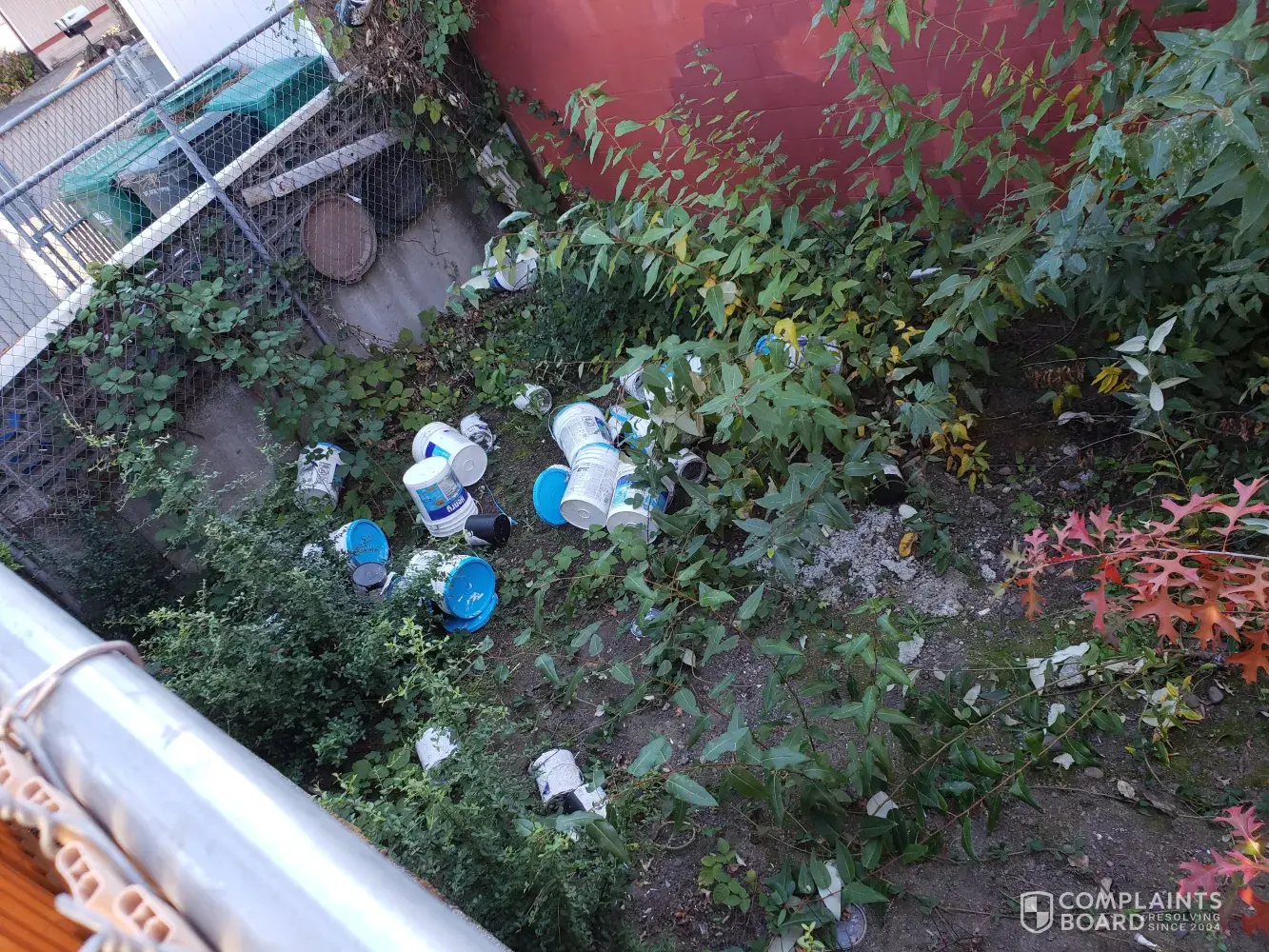 The garbage has been on their side since I moved into my home in May 2018, and that is where I returned it. The buckets and lids at one time contained roofing material.