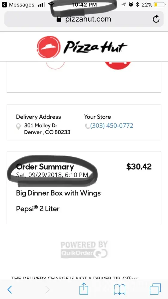 On 9/30/18 my daughter ordered me pizza from the hut which her order came to 25.00 and change..