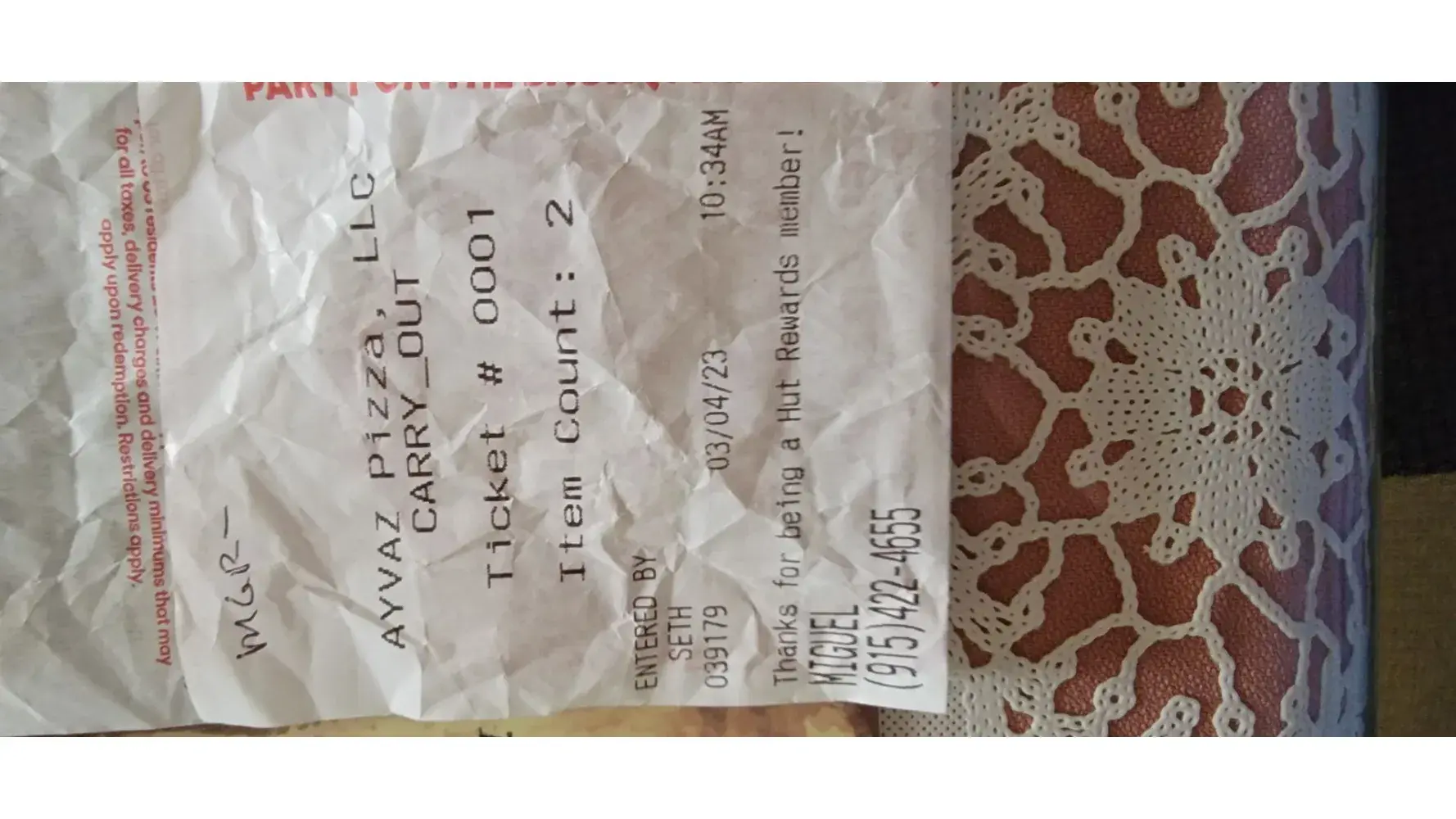 I placed an order over the phone for pickup on 03/04/2023 @ 10:34 AM for my wife and 89 year old mother. This is the Pizza Hut on George Dieter & Trawood in El Paso, TX 79936.