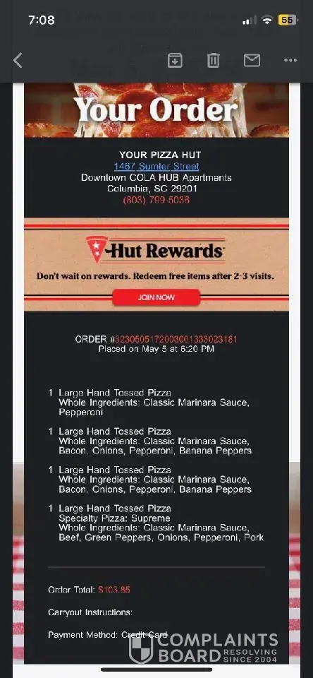 On May 5, 2023, my daughter ordered pizza online, and after she pushed the submit button, she realized the pizza hut the order was placed at was over 3 hours away. She immediately attempted to cancel the order, but everytime she called they hung up on her. After the 3rd time calling back she asked to speak with a manager, but got hung up on again. We...