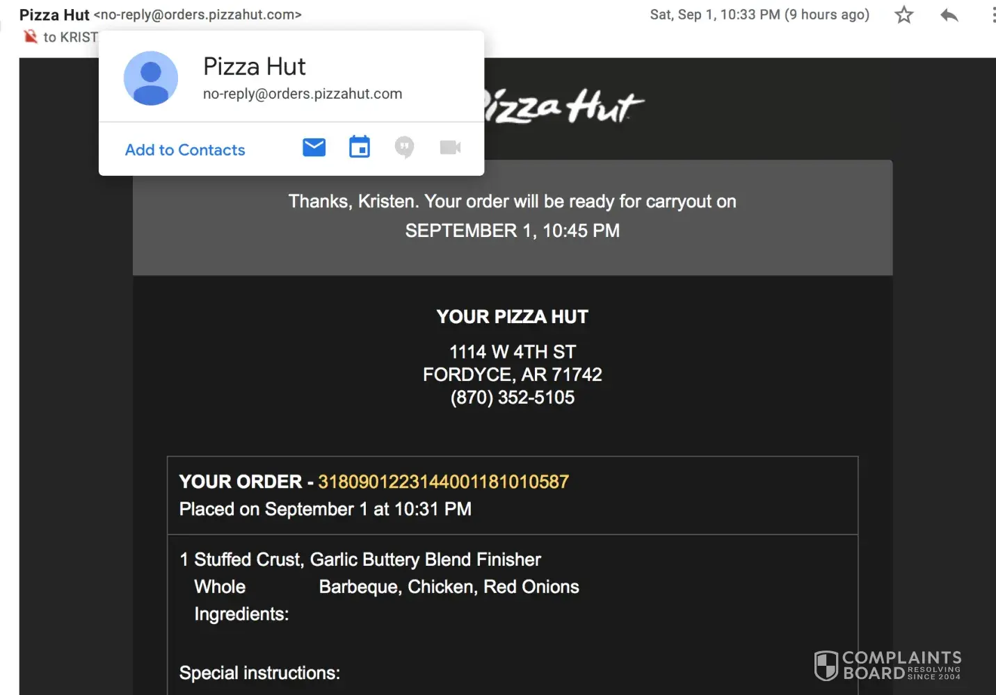 Yesterday I was driving through Fordyce, AR after a football game in Pine Bluff, AR. I placed on online order with Pizza Hut their at 10:31 pm. I received the email saying my order was placed at 10:33. I arrived at the store at 10:40, the door was locked. I called, the first time no one answered, and they immediately turned there lights off. Called and someone answered ; told me they closed at 10 pm. If that was the case I know I would not have been able to even place an order online. It also says online that they are open until 11:00 pm. If they were not going to make my order they could have called and told me. I should not have had to experience that. I am highly upset and went to bed hungry because nothing else was opened that I eat.