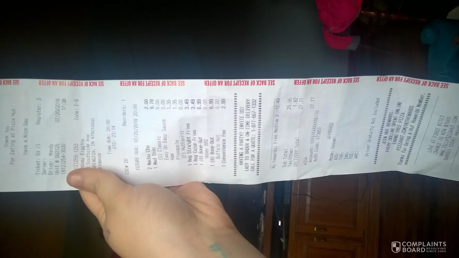 Last night july 20, 2018. My husband and I ordered pizza hut for delivery at the washington indiana store like we do every weekend. We ordered via online so we could use some of our my-rewards points along with the rest of our order. When it was 7:30pm there was a male delivery driver who had me sign a receipt gave me what was supposed to be my order and just walked off no thank you no nothing when I opened the box it was not my order at all. So I hollered before he left and told him it was not my order. Minutes later a lady showed up which says her name was mandy on my receipt she had the correct order but my pizza looked like it had been completely ran over or smashed! Then I went to eat my french fries and my bbq bone out wings there was a huge long black hair in my fry that I bit into! I threw up every bit of my food and threw everything in the fire! I have always been a loyal customer but after last night unless it gets fixed I will never order from pizza hut again!