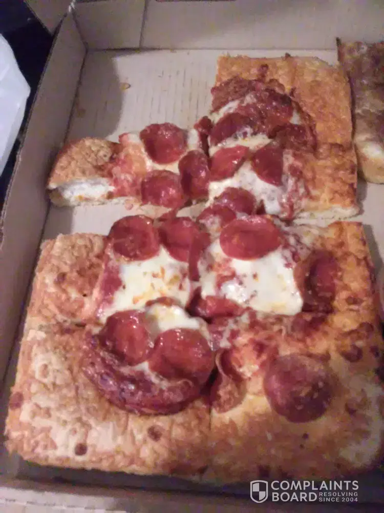 I ordered a dinner box and picked it up. I saw the girl at the counter look at it so I assumed it was okay. I was very wrong! I am enclosing pictures of what it looks like. Awful. The manager told me I needed to drive the pizza back to the store so she could see it with her own eyes, lavinia is her name. I have 2 broken wrists with casts on. The fact that I made it to the store the first time was painful enough, let alone the 2nd trip.