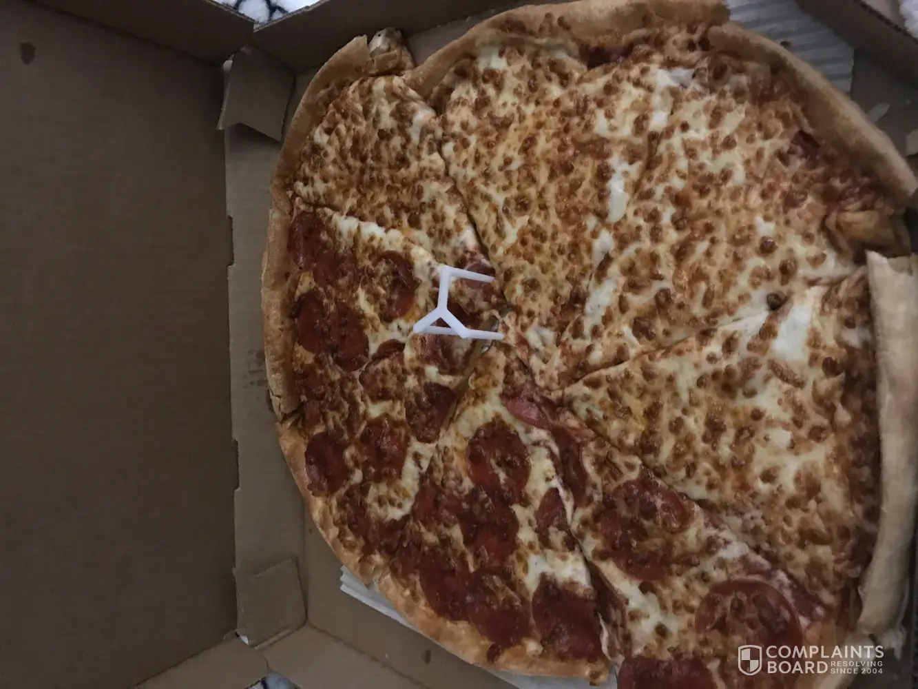 Ordered a thin half cheese half pepperoni extra sauce extra cheese with a 2-liter of soda. This is what I receive. (See picture below). This is my home pizza delivery store, it's very hit or miss. Sometimes you get lucky and get what you ordered other times order is wrong or you receive an upside pizza. I had to quit ordering from this store for the longest time because anytime you order the people making the food were smokers and the food would taste like cigarette smoke. I've been trying to give this store another chance since a new store manager took over the store in November but the past 3 orders have been wrong. I called the store and yes they are remaking but no telling what the next pizza will look like or how long it will be before I receive.