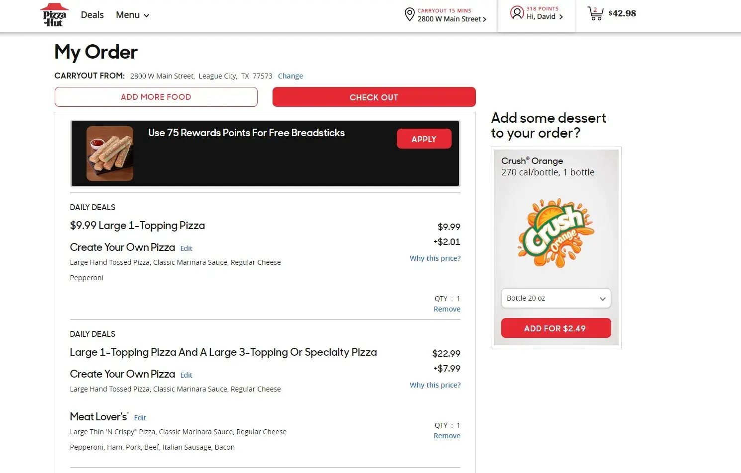 This evening I tried to place an order online using Pizza Huts "daily deals". It was a 1 topping large and a large 3 topping or specialty pizza for 22.99. Well, I tried to order a large hand tossed cheese pizza and a large meat lovers, for the 22.99, as I looked at the order, there was an additional charge of 8.99. When I checked the "why this fee" it said I added additional toppings. But I had not. I tried to order a large hand tossed peperoni pizza, for the daily deal price of 9,99, and there was a 2.99 added charge for the additional toppings or special crust. Now tell me, when you order on line for carry out, and you try to use an advertised special, why is there additional fees added to the special price not making very special.