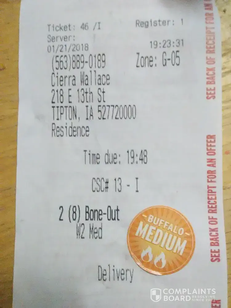 I ordered two orders of eight wings and one order of garlic knots I have the online reciept from my email charging me for that. I left before the delivery arrived my dad had a stroke so my babysitter answered the door and didn't know what I ordered to yell the difference I just got home and she says they brought one order of wings with six enclosed and one order of burnt breadsticks I then look at the reciept that the delivery driver gave her at the door it had 2 orders of wings on it . My card was charged for the full amount of two orders of wings and the knots I never recieved. I am sending u a copy of both recipients