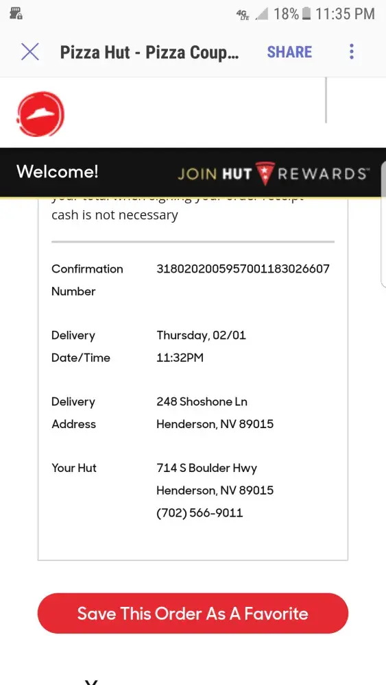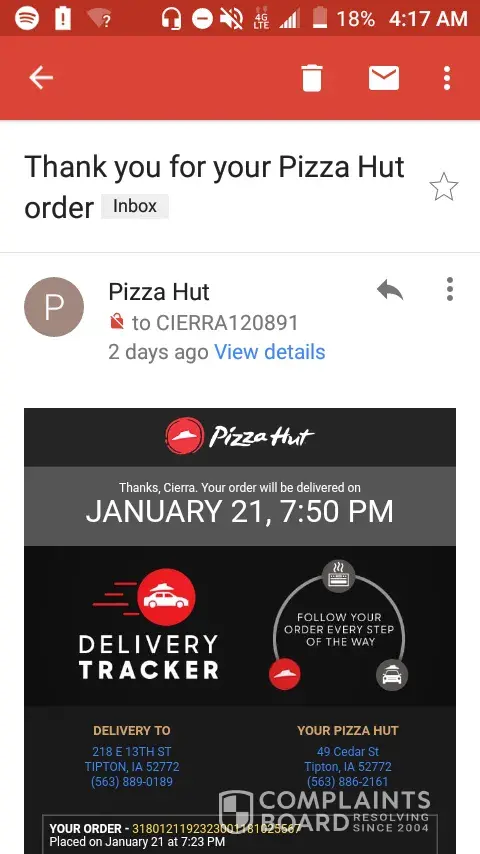 My name's Taylor brown i live in Henderson Nevada I placed an order online last night and never received my order I will send an attachment with my order confirmation. On the tracker it stated it was in the oven but never went any farther. It was a late order and I didn't know when exactly the store closed but online said they were open and took my order I tried to call after about 45 minutes to an hour and the store is closed. I placed my order when the store was still open but never received my food. I've never had this happen at any pizza please or even a delivery place.